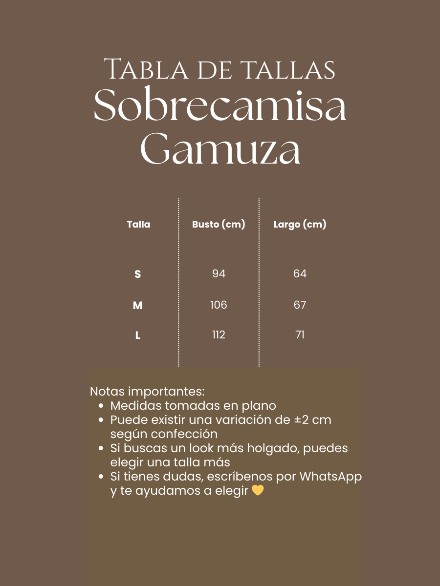 La Sobrecamisa Gamuza es LA pieza statement que transforma cualquier outfit. Diseño exclusivo de nuestro taller en gamuza premium, con bolsillos funcionales oversized y broches de metal de calidad. Cada detalle fue pensado para durar y lucir impecable temporada tras temporada.